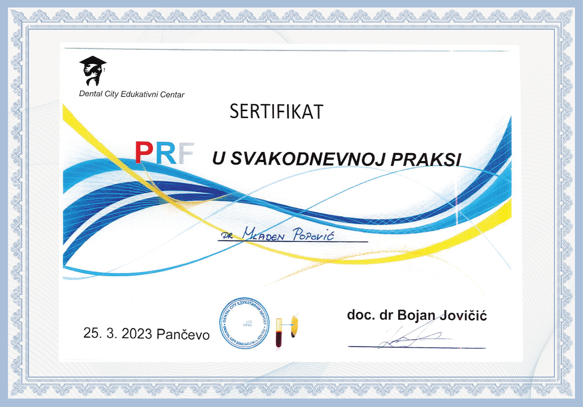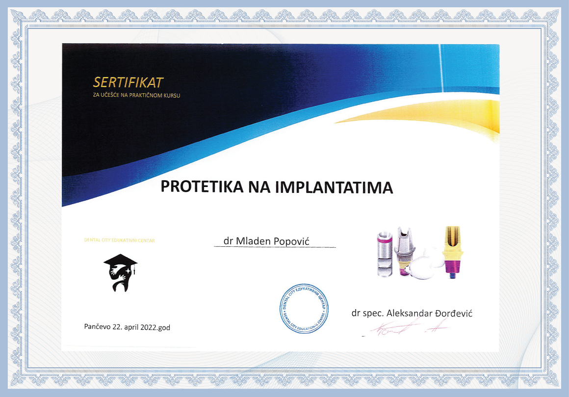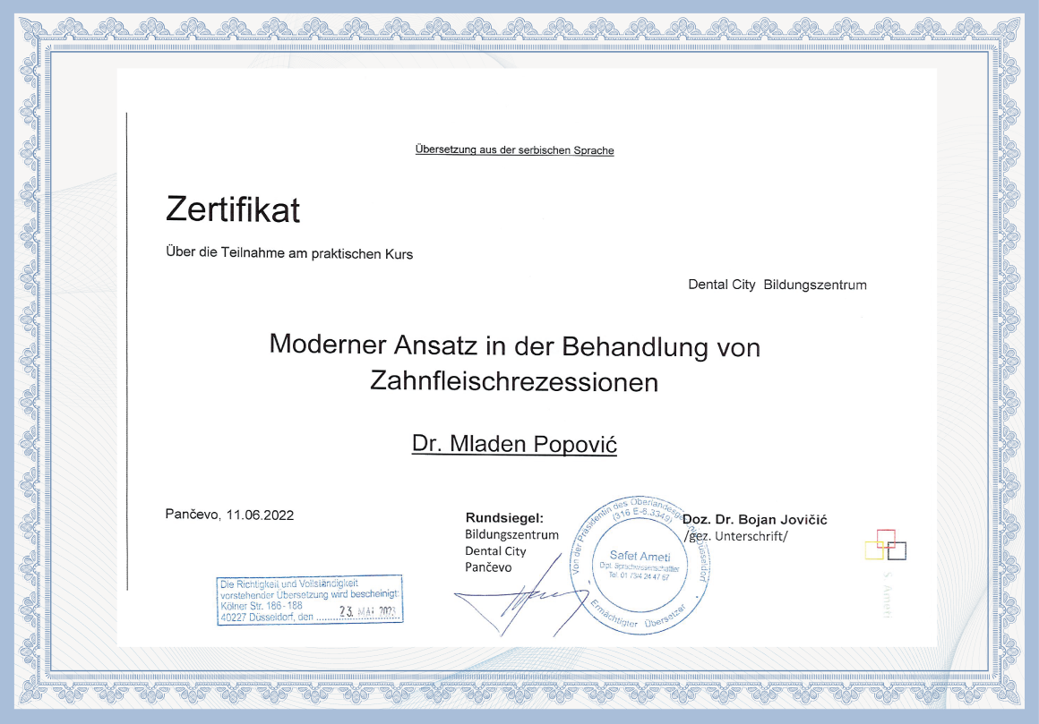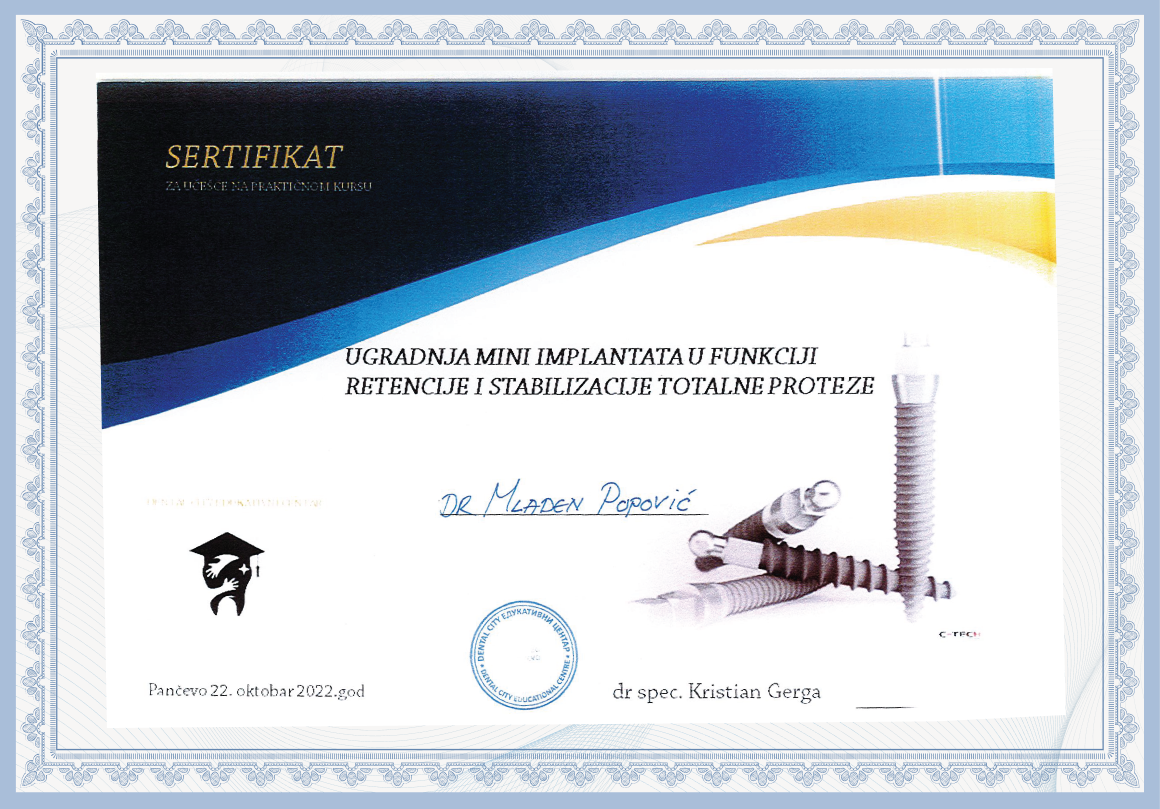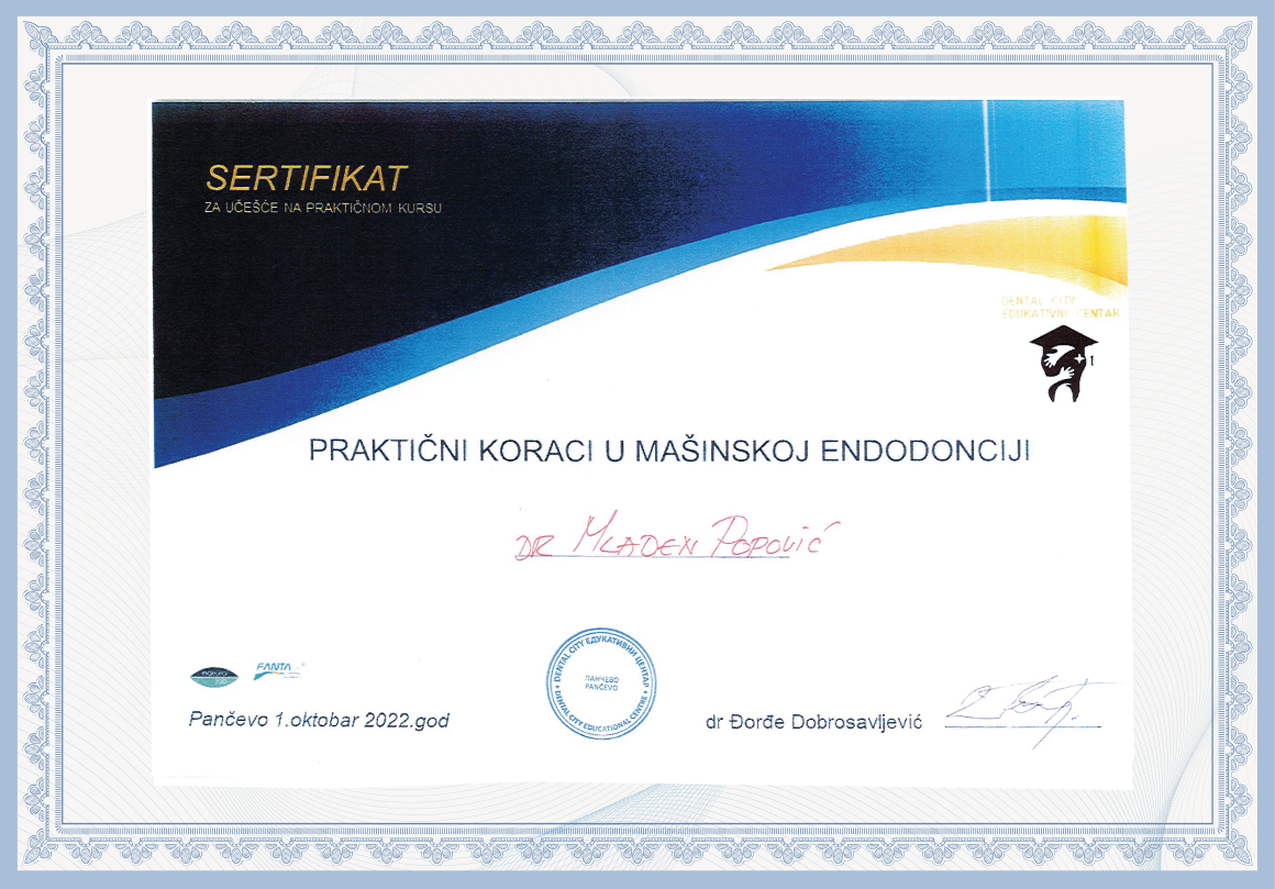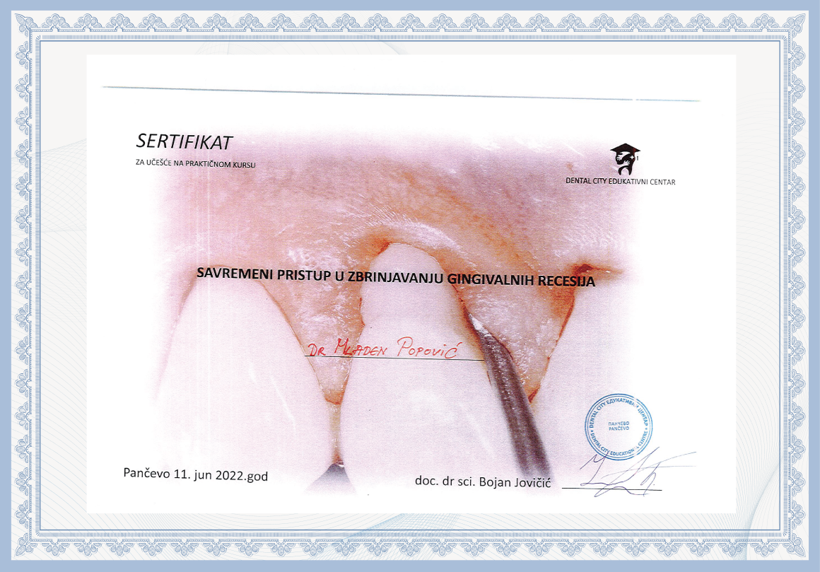 2022 – Uspješno sudjeluje u praktičnom kursu „Savremeni pristup u zbrinjavanju gingivalnih recesija „, gdje je aktivno učestvovao u radionicama i stekao napredno znanje o najsavremenijim tehnikama u liječenju gingivalnih recesija.
