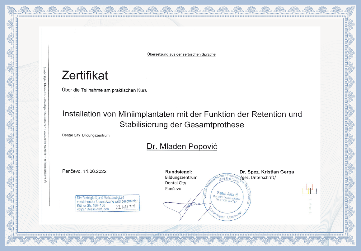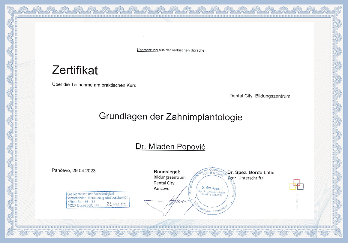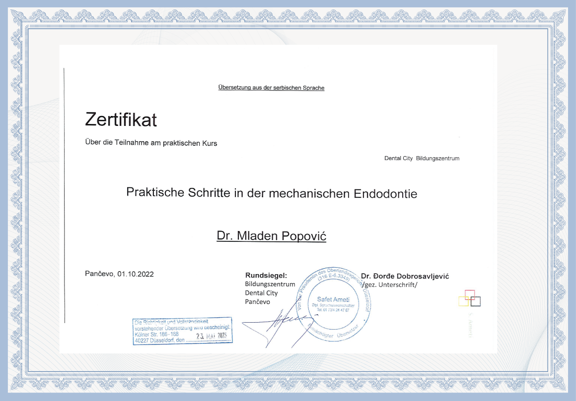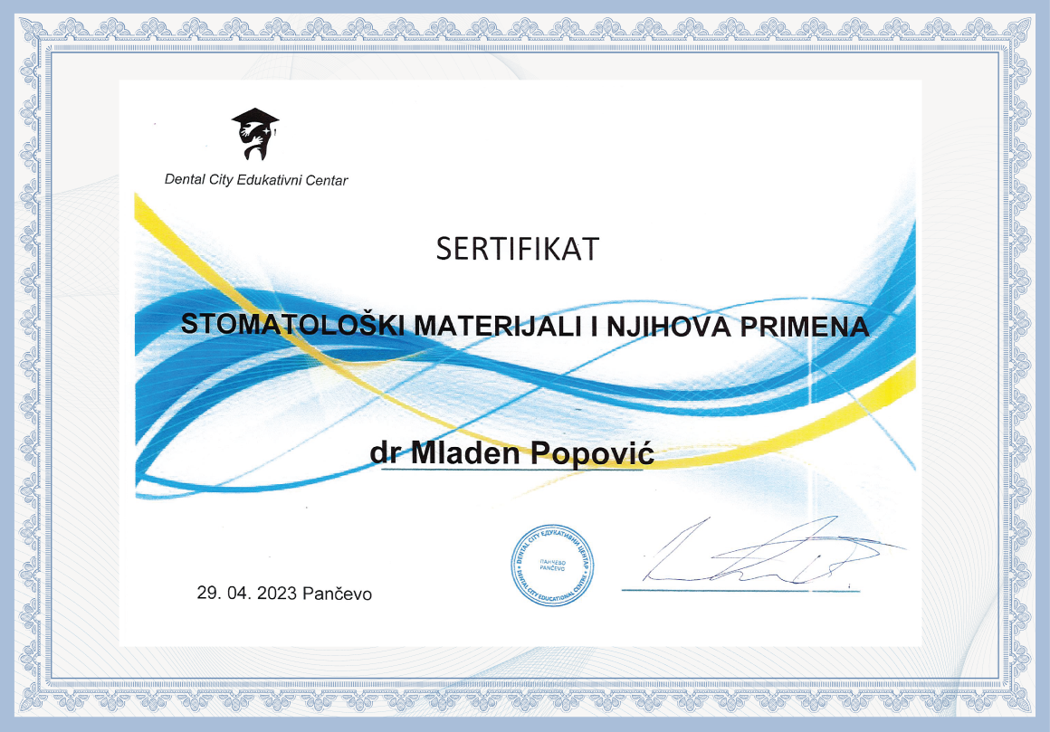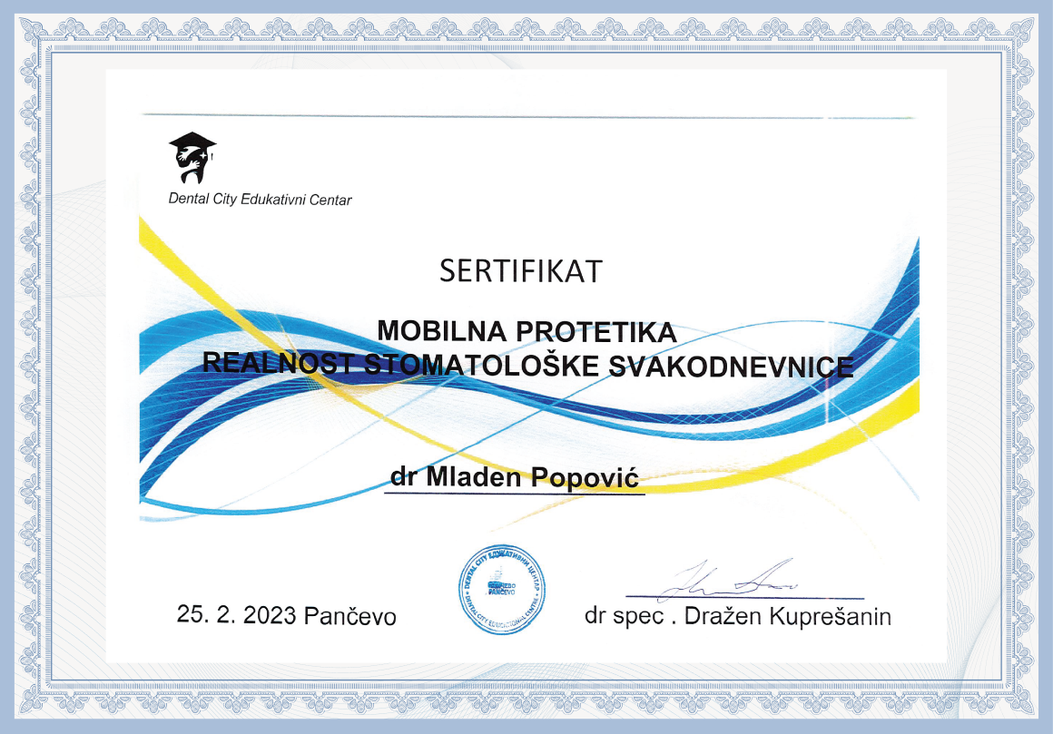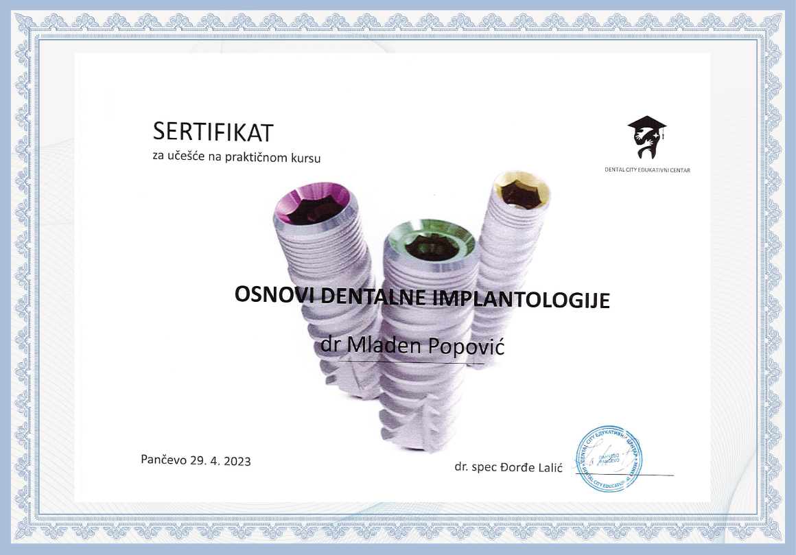 2022 – Uspješno sudjeluje u praktičnom kursu „Savremeni pristup u zbrinjavanju gingivalnih recesija „, gdje je aktivno učestvovao u radionicama i stekao napredno znanje o najsavremenijim tehnikama u liječenju gingivalnih recesija.
