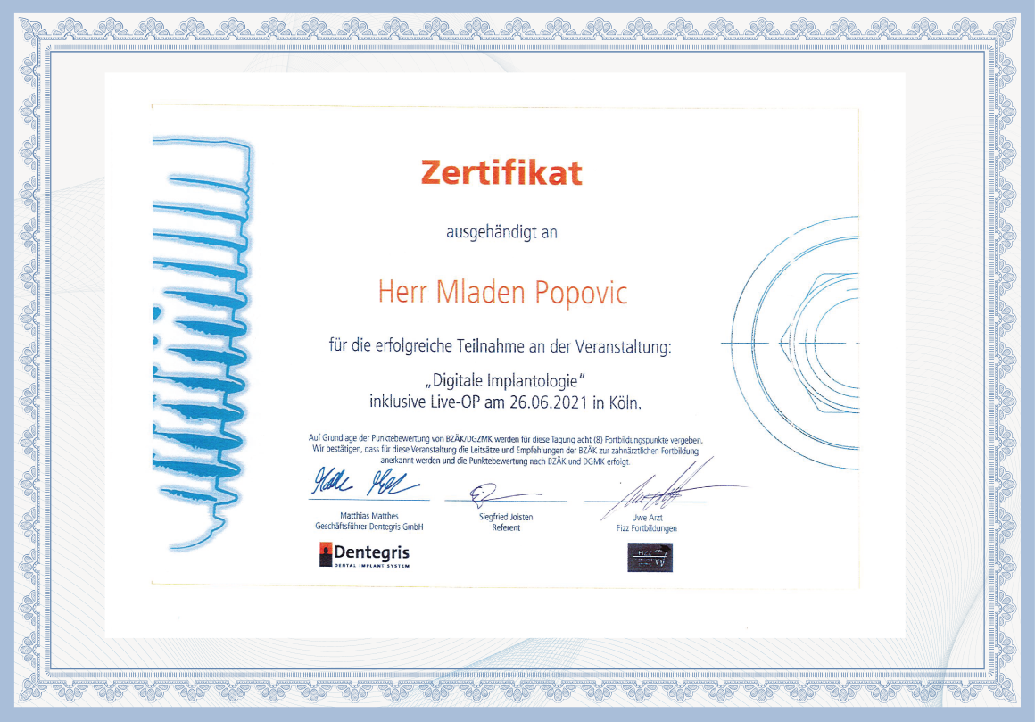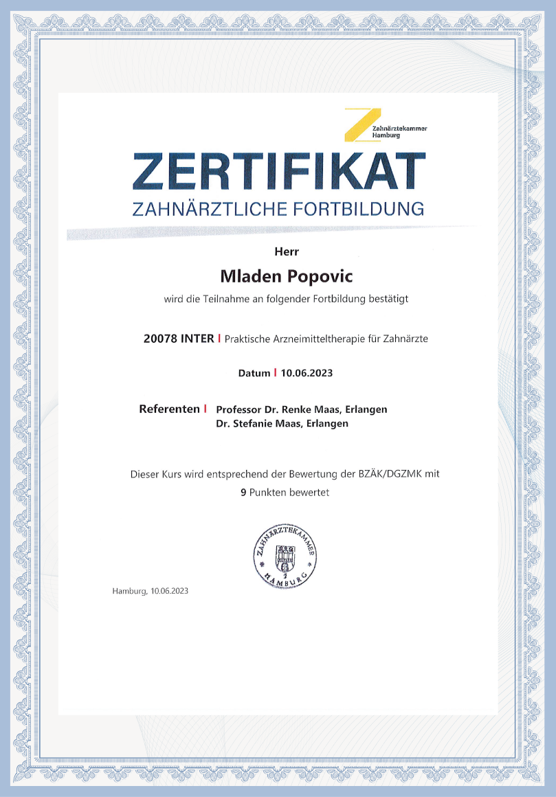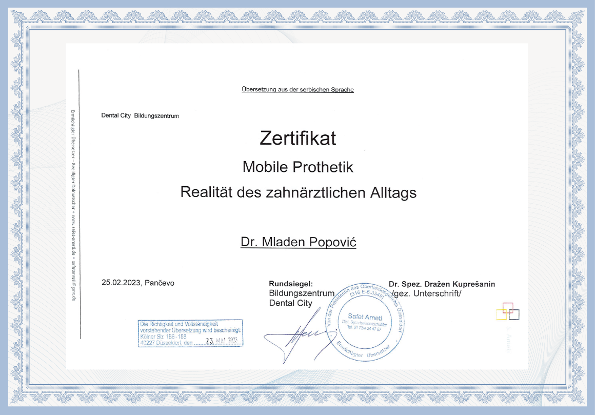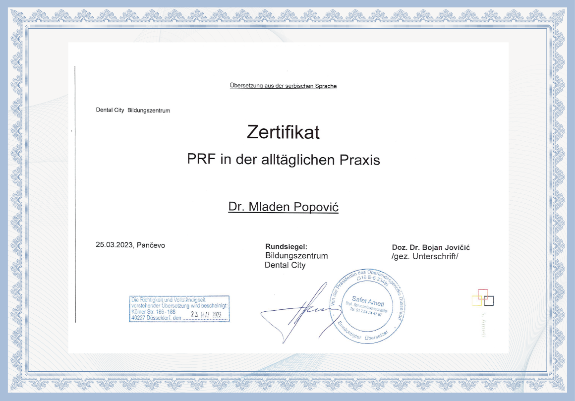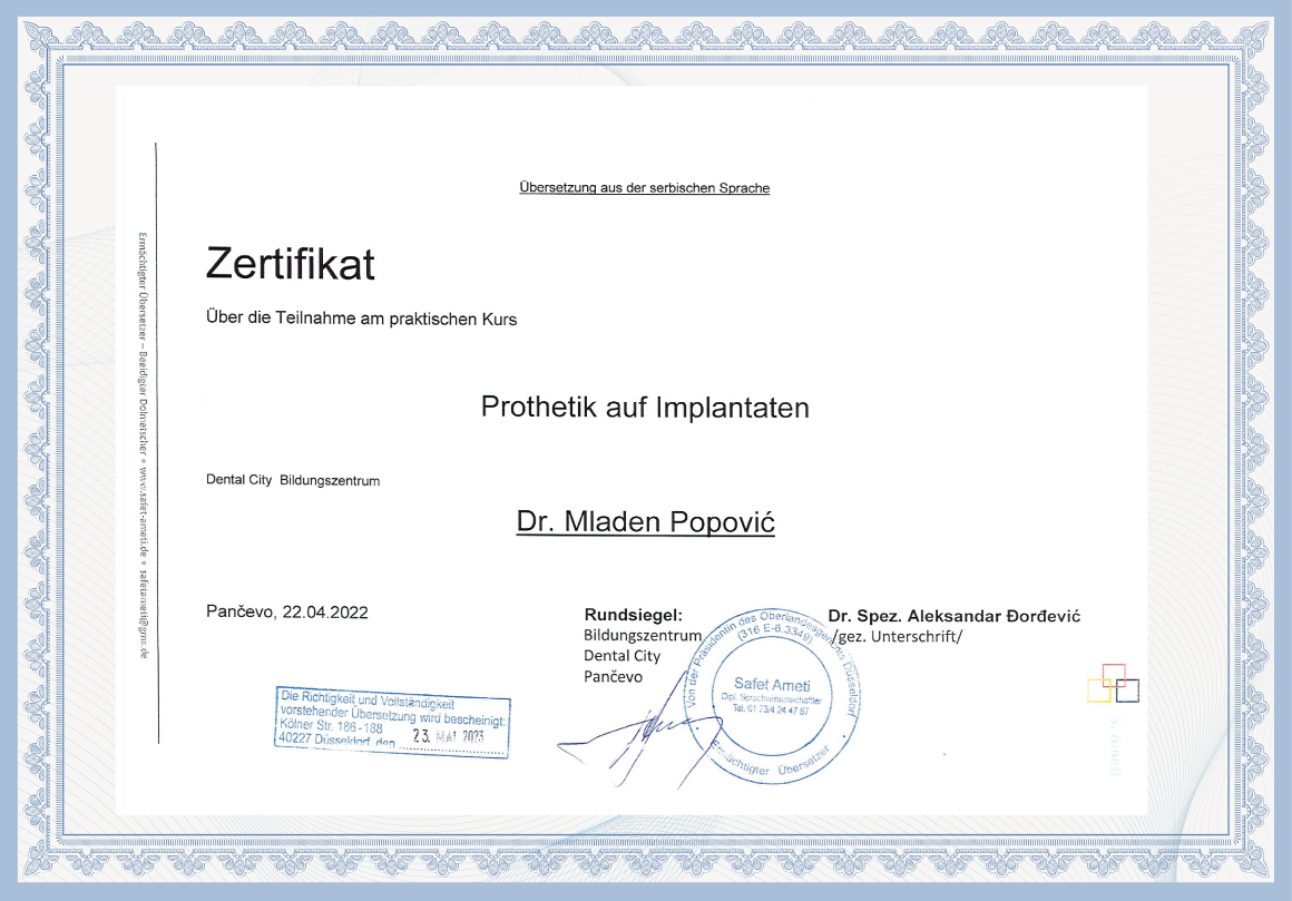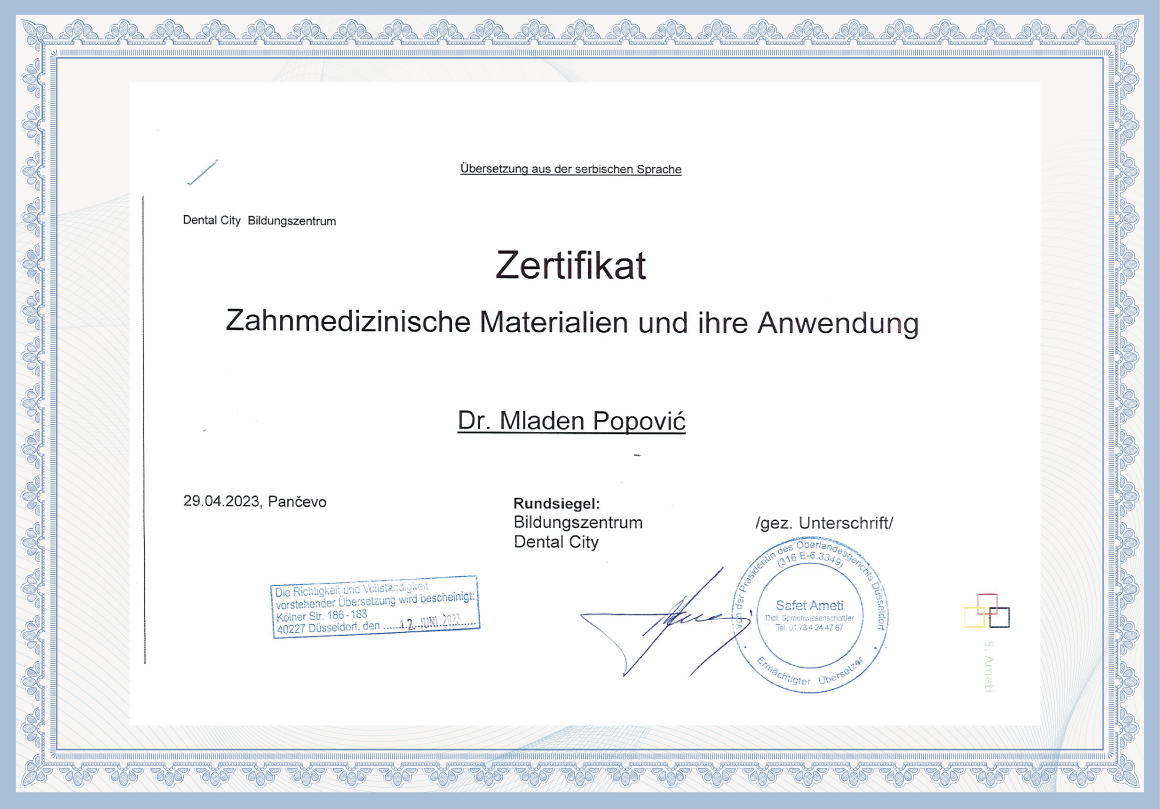 2022 – Uspješno sudjeluje u praktičnom kursu „Savremeni pristup u zbrinjavanju gingivalnih recesija „, gdje je aktivno učestvovao u radionicama i stekao napredno znanje o najsavremenijim tehnikama u liječenju gingivalnih recesija.