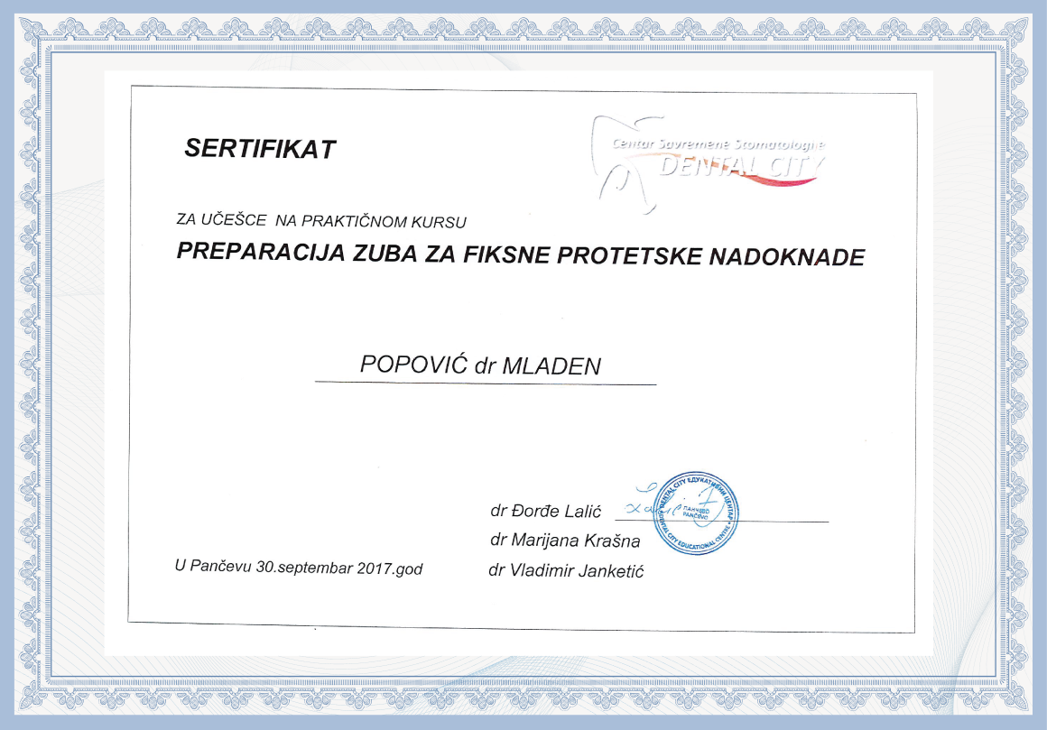 2017 – Učestvovao na praktičnom kursu Dental City te stekao priznanje kroz završene kurseve i obuke u području preparacija zuba za fiksne protetske nadoknade što je rezultiralo dodjelom sertifikata.